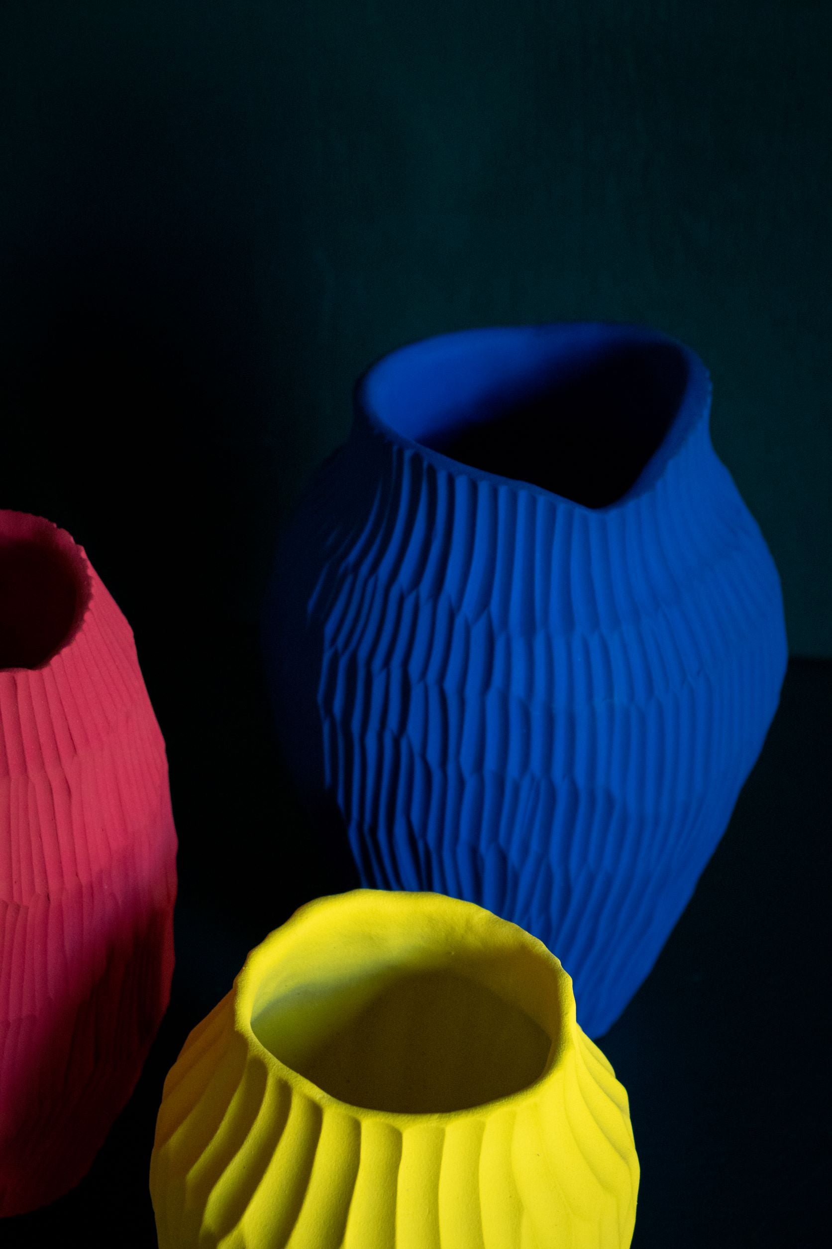 Each piece is designed with the intention to bring energy and excitement to the ambient it’s placed. The clay used for this collection is a stoneware clay and the colours that create its unique personality vary depending on the light of the ambient.